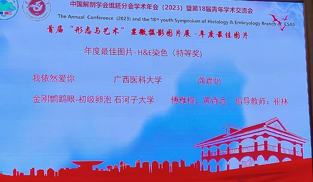 7月18日,中国解剖学会组胚分会首届“形态与艺术”显微摄影比赛、首届中国医学本科生组织胚胎学教学模型设计大赛在遵义医科大学举行。大象传媒大象传媒 崔林老师指导的临床医学2020级傅雅楠、黄诗远同学参赛作品《金刚鹦鹉眼—初级卵泡》荣获显微摄影比赛特等奖、《中肠旋转形成模型》荣获模型设计大赛二等奖。