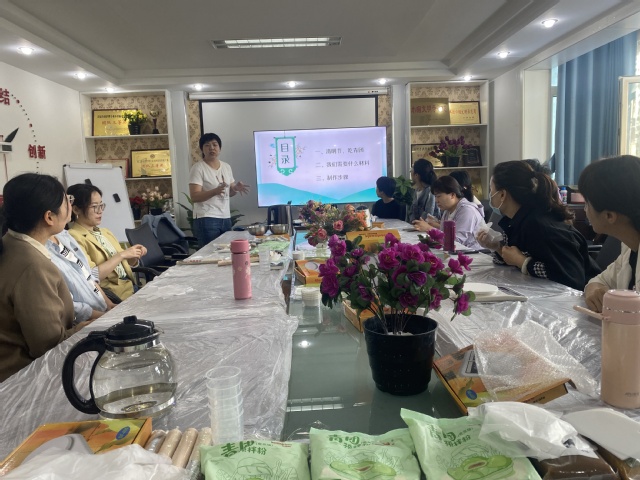 “碧玉团圆满屉香,素舂柔艾捣砧忙。”活动开始由姬春老师为大家讲解清明节吃青团的由来、寓意和营养价值,她讲到:“青团是江南地区的传统特色小吃,在江南,人们把每年第一次吃青团叫做‘尝春’,相比于其它食物,青团本身所承载的情感内核,使其成为了传统节日、传统文化的现实载体。”接着又为老师和同学们详细介绍了青团的制作步骤。