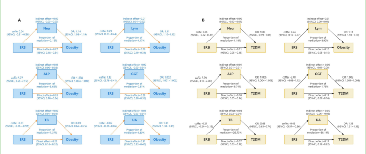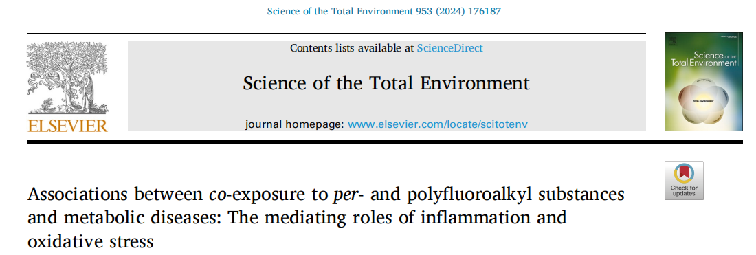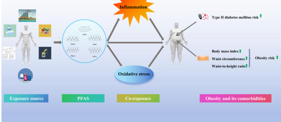全氟和多氟烷基物质(PFAS)是一类具有高度氟化特性的合成化合物,其分子结构中含有至少一个全氟或多氟烷基链,因其优异的疏水性和抗油性而广泛应用于工业和消费品中。然而,由于其持久性、生物积累性及潜在的生态和健康风险,PFAS已成为全球环境科学和公共卫生领域的重要研究对象。该研究深入评估了PFAS联合暴露对肥胖和2型糖尿病(T2DM)的影响,并探讨了炎症和氧化应激在这一过程中的中介作用。研究结果显示,环境风险评分(ERS)每增加一个单位,肥胖和T2DM的几率分别显著增加3.60倍和1.91倍。同时,ERS的增加还与BMI、腰围以及腰高比的显著上升密切相关。进一步的分析发现炎症和氧化应激在ERS与肥胖和T2DM关联中起到了显著的中介作用。这一发现揭示了PFAS联合暴露与肥胖和T2DM之间的潜在关联,并提示这些关联可能由炎症和氧化应激所介导,为深入理解PFAS的健康影响提供了新的视角。