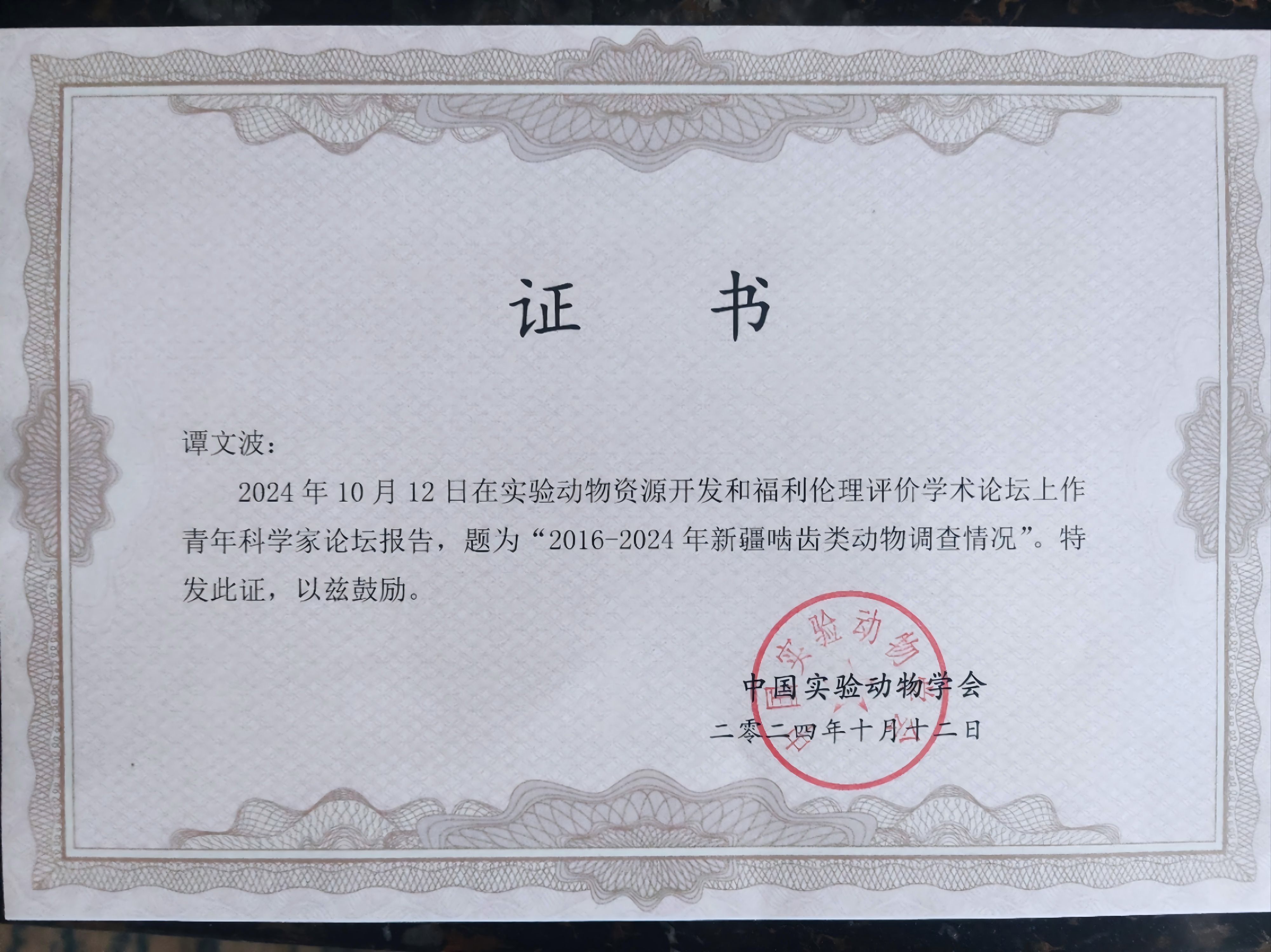 近日,中国实验动物学会实验动物资源开发和福利伦理评价学术论坛在青岛胜利召开,校实验动物中心办公室主任谭文波成功当选新一届中国实验动物学会实验动物资源鉴定与评价工作委员会委员,并在大会青年论坛主讲了题为“2016-2024年新疆啮齿目和兔形目动物调查”的报告,广受业内好评。