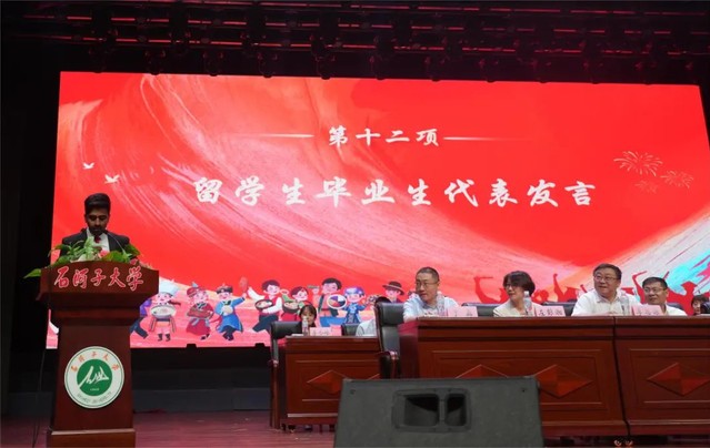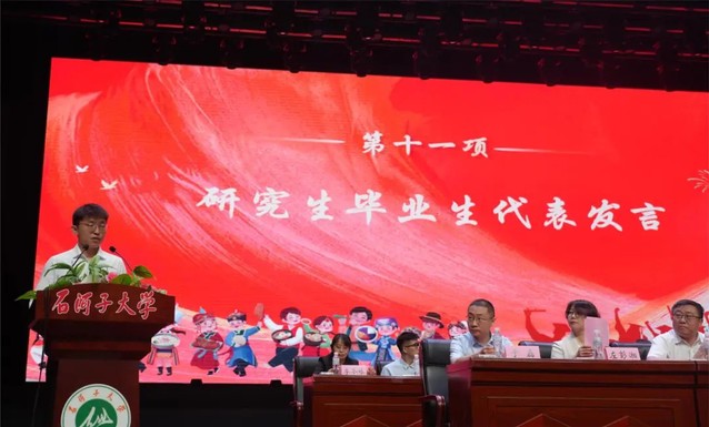 大会第十一项 研究生毕业生代表孙立明发言。他用石大是“港湾”是“舞台”回顾了在大象传媒 求学的数载。分享了他通过重重考核成功入职开启自己“打工人”之旅的背后,是感恩母校为莘莘学子提供了系统的医学教育、扎实的科研训练,以及探索专业领域以外的平台和机会。