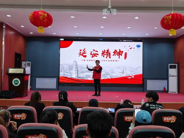 随后,宣讲团队长赵恒向在场的师生们详细介绍了延安的地理位置、历史背景及其独特的文化和产品。他讲到,延安不仅有着丰富的历史文化资源,还有着许多优质的农产品和手工艺品。例如,延安苹果以其甜美的口感和脆嫩的质地闻名遐迩,延安红枣则因含有丰富的营养价值而受到消费者的青睐。