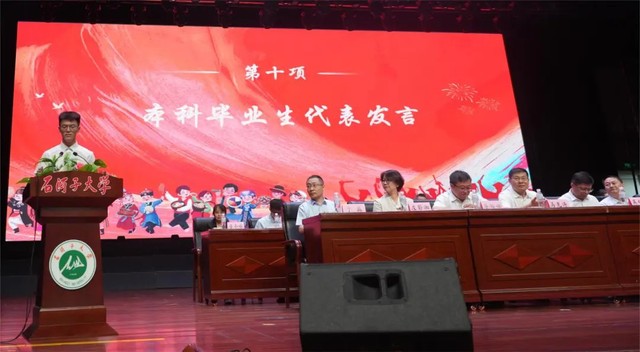 大会第十项 本科毕业生代表杜威发言。他用“感动、感谢、感恩”作为主题词,讲述了他与石大大象传媒 邂逅的故事,他号召各位毕业生朋友们在未来不断学习积极进取,为祖国的医学事业贡献力量,同时祝福老师们身体健康、工作顺利,祝愿母校人才辈出、永续华章。