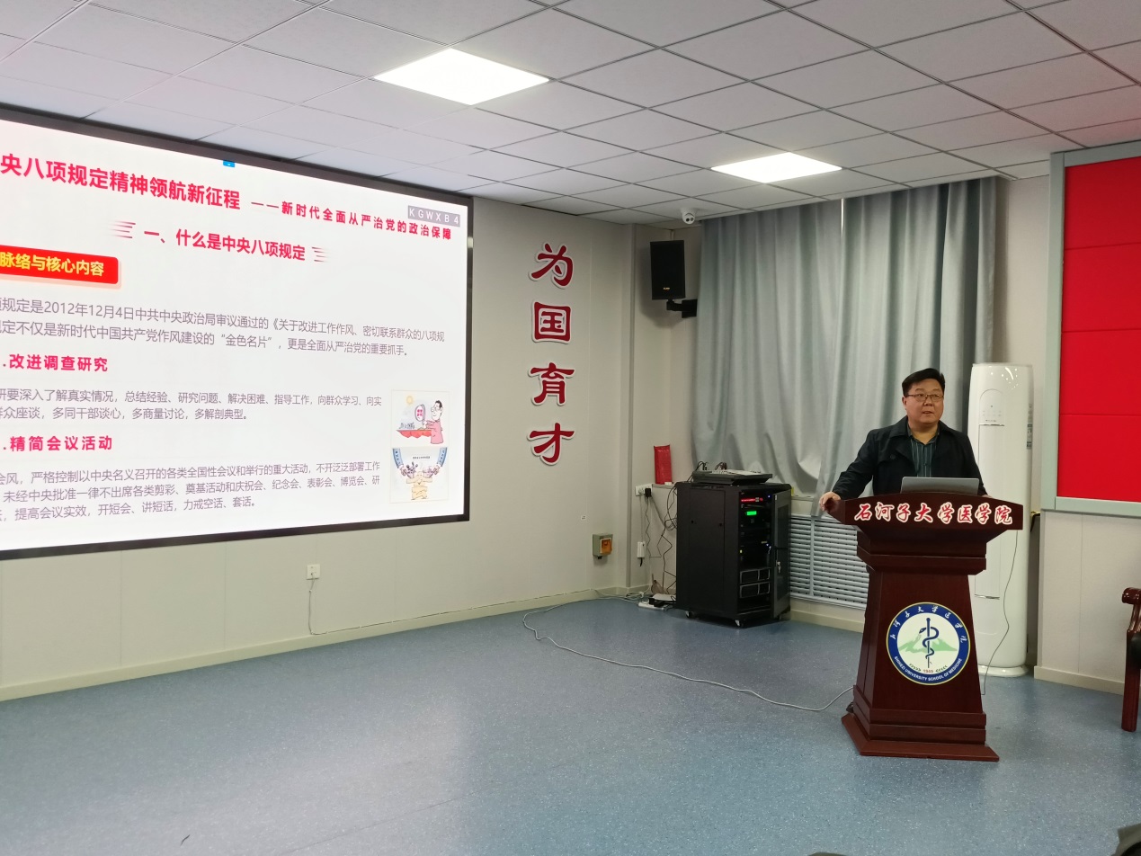 会上,张青书记宣讲了题为《以中央八项规定精神领航新征程——新时代全面从严治党的政治保障》的专题党课,从四个方面系统解读了中央八项规定的内容、精神、以及为什么学,如何深入贯彻落实等,宣讲既有理论高度,又结合了实验中心实际,张书记指出医学教学实验中心作为大象传媒 教学的一线单位,要尤其注重规范实验耗材采购、设备使用管理等环节,“把纪律意识融入日常教学科研服务”。他强调“八项规定是长期有效的铁规矩,必须从细微处筑牢防线”。这次的宣讲让我们深刻认识到中央八项规定不仅是纪律要求,更是推动大象传媒 工作高质量发展的行动指南。希望全体老师们以此次宣讲为契机,将八项规定精神内化于心、外化于行。在今后工作中,严格对照规定自查自纠,切实改进工作作风,将八项规定落实到实际行动中。