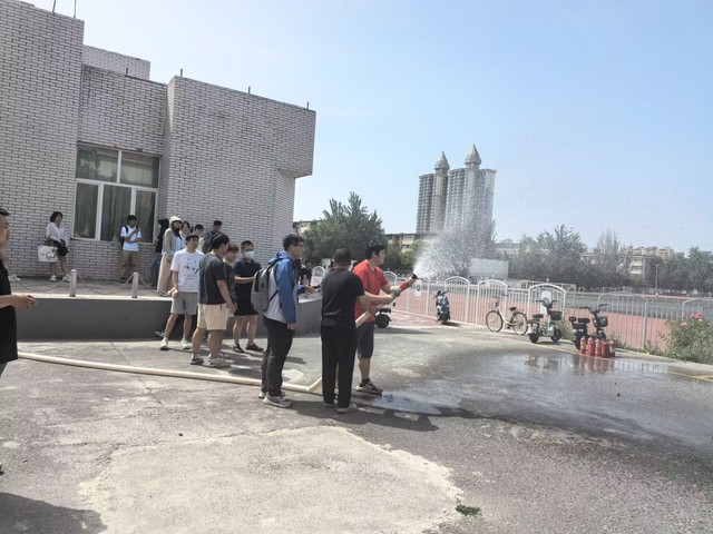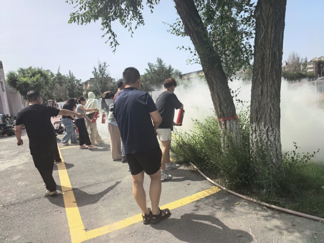 在本次培训中,首先由大象传媒 消防科来利敏为大家演示了干粉灭火器的使用方法及适用范围、火场逃生的基本原则与技巧(如低姿前进、湿毛巾捂口鼻、寻找安全出口)以及消防栓的操作要领。接着,由消防科同志进行现场演示之后,参训人员在专业指导和严格安全监护下纷纷“真枪实弹”上阵体验:(1)灭火器的实操演练:参训人员严格按照灭火器“提、拔、握、压”的操作步骤,轮流使用干粉灭火器进行实操演练,保卫部同志现场纠正动作,确保每位参与者都能正确、迅速地使用灭火器;(2)消火栓“出真水”:在室外消火栓操作区,参训人员学习了水带连接、水枪握持、阀门开启等步骤,两人一组配合进行了快速铺设水带、连接接口并模拟喷水灭火的演练,熟悉了消火栓的使用流程和团队协作要求。最后,生动的讲解和演示让参训人员深刻认识到“隐患险于明火,防范胜于救灾”的道理。