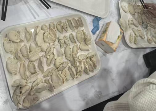 活动中,一场别开生面的包饺子环节将气氛推向高潮。饺子作为中华传统饮食文化的重要象征,承载着团圆与美好祝愿。老师们亲自上手,手把手教留学生们包饺子。从擀面皮、放馅料,到捏褶子,每一个步骤都充满了乐趣。留学生们积极参与,尽管手法有生疏又熟练,但都乐在其中。有的包出的饺子形状各异,充满创意;有的同学则包得有模有样,令人称赞。手艺稍好的同学还主动当起了“小老师”,耐心指导身边的小伙伴,在一来一往的交流互动中,大家的情谊愈发深厚。