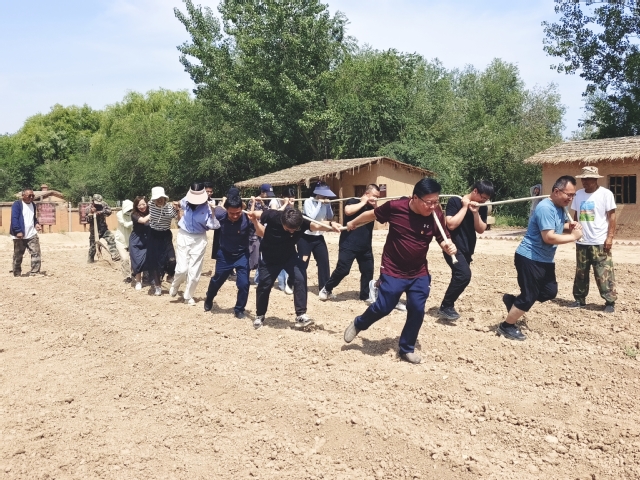在垦荒体验区,老师们跃跃欲试,纷纷参与体验开垦劳动,两列队伍俯身弓步,拿起犁绳扛在肩头,将插在土里的犁铧不断拉向前进,沉浸式感受人拉肩扛,这是兵团人来时的路,烈日当空也难掩老师们的热情。