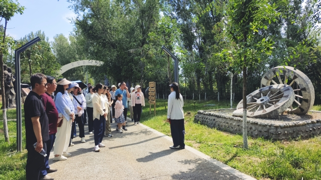 在讲解员的引导下,党员教师们参观了打夯、拉犁、打井等雕塑群以及地窝子、干打垒等充满革命色彩的建筑。陈列室里的放映机、老式喇叭、农具等历史物件以及团部礼堂内一张张黑白照片,都在诉说着老一辈兵团人艰苦创业的故事。