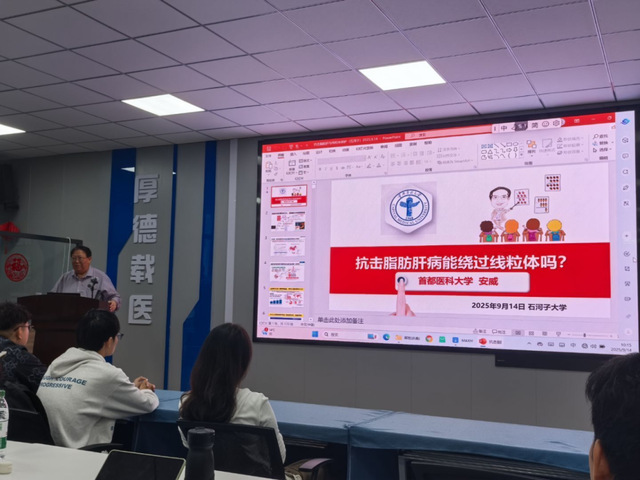 安威教授以《抗击脂肪肝病能绕过线粒体吗?》为题,深入剖析了线粒体功能障碍脂肪性肝病发生发展中的关键作用。将线粒体的内膜和外膜分别比喻为“长江”和”黄河”,脂肪的转运体CPT1和CPT2比喻为“羊皮筏”和“牛皮筏”生动形象的阐述了“脂肪在线粒体里究竟如何燃烧”;融合分子,剪刀分子如何维持线粒体的动态平衡;线粒体与内质网的互作等内容。讲座现场气氛热烈,让师生们对脂肪肝病与线粒体的关联有了更深刻的认识,为慢性肝病基础与临床转化研究提供了新思路。