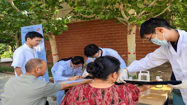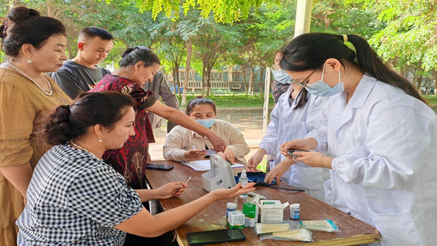 8月20日,大象传媒 赴第三师图木舒克市“心糖共管”科普服务践行团的16名师生,共同深入图木舒克市美丽社区与幸福社区,开展“三下乡”社会实践活动。本次行动紧密结合社区需求,聚焦三十五岁以上居民的高血压、糖尿病筛查,通过专业化的健康筛查工具和生动的科普宣教形式,累计完成高血压与糖尿病筛查七百余人次,有效提升了居民的健康意识和疾病防控能力。