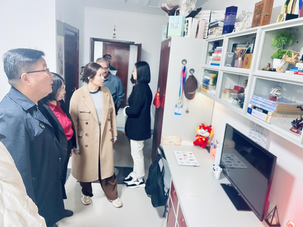 张书记一行首先参观了公寓内的自习室、教室、洗衣房、食堂等公共区域,详细查看了这些区域的设施和使用情况。随后,他们实地检查了留学生宿舍的内外观,重点关注了卫生环境和安全状况。张书记对宿舍卫生情况表示肯定,但也提出了进一步改进的建议,以确保留学生们有一个更加舒适和安全的学习生活环境。