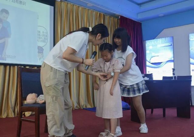 活动现场,实践团成员用通俗易懂的语言和模型演示,将专业急救知识转化为孩子们易于理解的内容。“遇到有人吃东西被卡住,手举不起来、脸发红,怎么办?”问题一出,孩子们小手纷纷高举,“从后面抱住他!”“用力顶这里!”答案虽显稚嫩,却抓住了要领。在成员们手把手的指导下,孩子们勇敢上前,模拟操作海姆立克急救法的“剪刀、石头、布”步骤,感受那份拯救生命的力量。