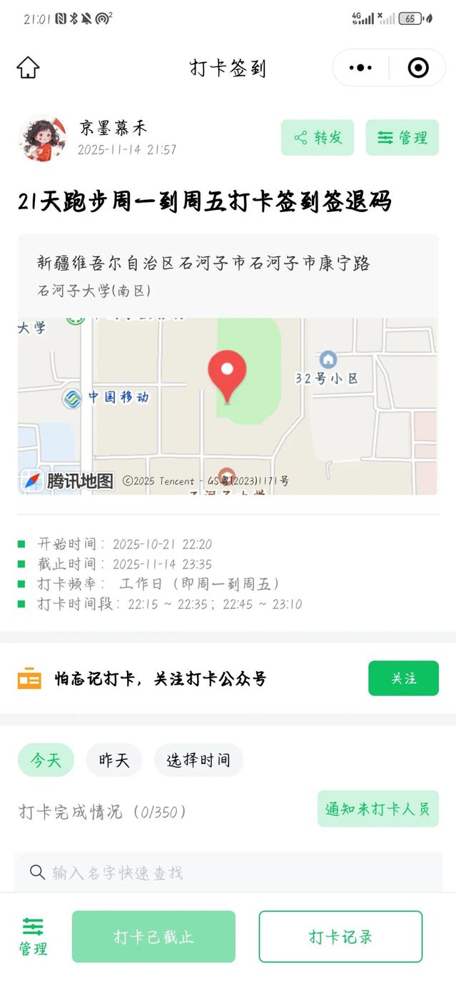 通过QQ推文、微信公众号、辅导员联动推广等多渠道宣传,活动吸引351名学生报名,其中25级新生参与占比达42%。21天内,微信小程序累计签到签退6829人次,有效打卡率85%,58人斩获“跑步之星”、126人获评“坚持之星”,QQ空间相关话题曝光超1.2万次,形成校园自发传播热潮。