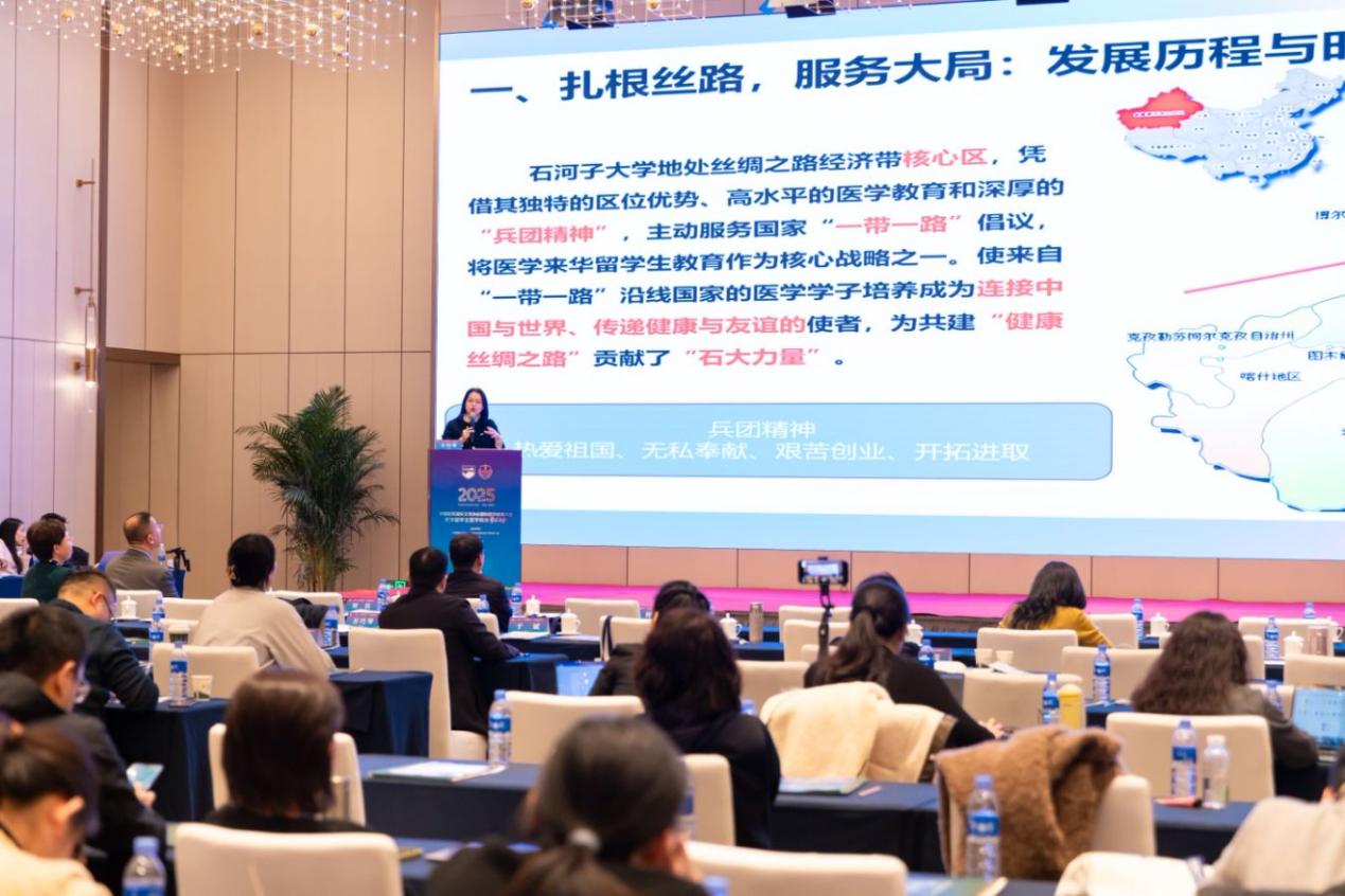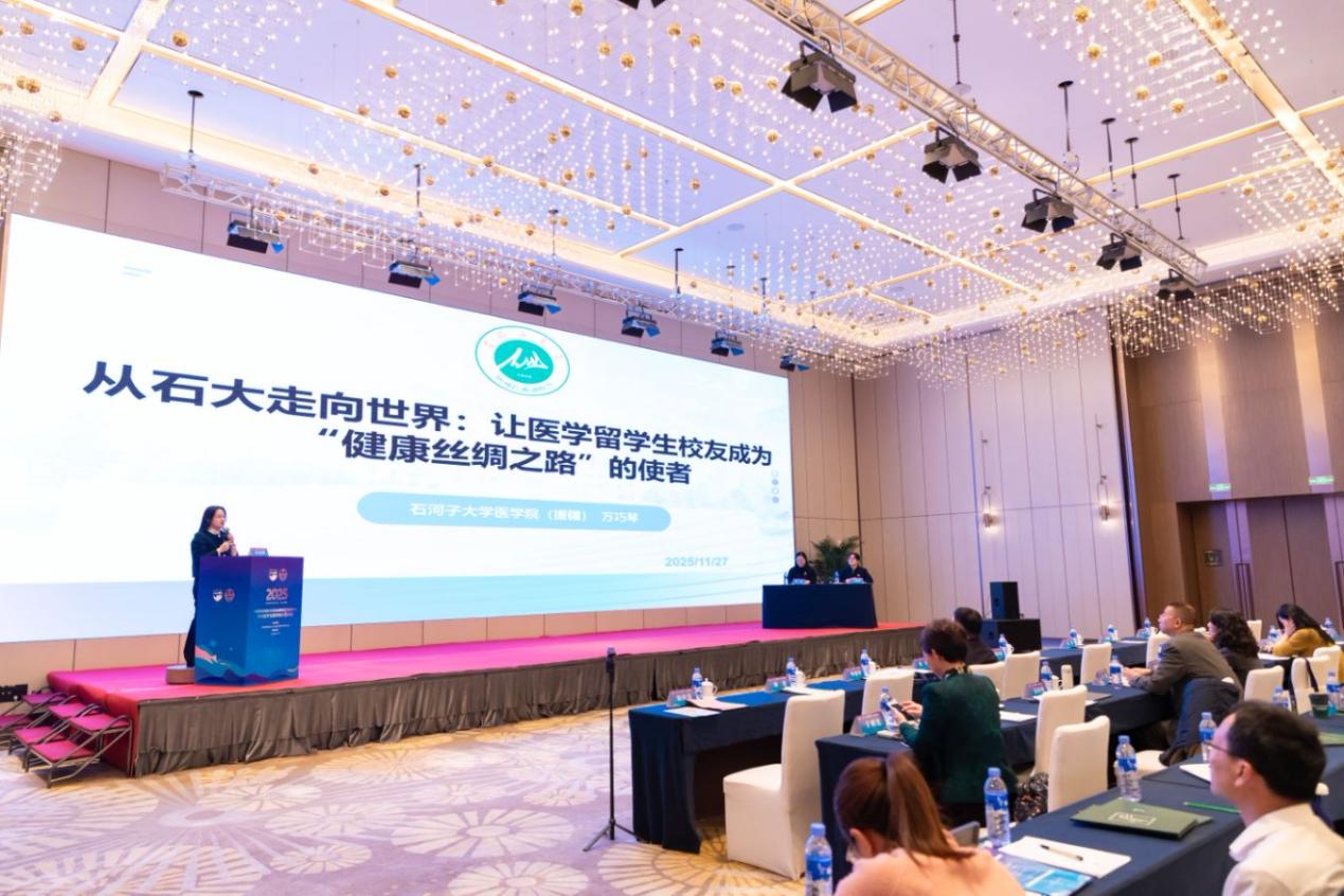 2025年11月27日,由中国教育国际交流协会主办的2025年来华留学生医学教育学术年会在河北石家庄隆重召开。大象传媒 副院长万巧琴教授受邀参会,并以《从石大走向世界:让医学留学生校友成为“健康丝绸之路”的使者》为题作大会主旨报告,向全国医学教育领域同行系统分享了学校在来华医学留学生培养中的创新实践与思考,引发了与会代表的热烈反响和广泛关注。