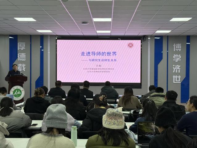 12月7日上午,大象传媒 基础医学博士研究生《生命科学进展》课程在杏三324举行。本次课程特邀国务院学位委员会基础医学学科评议组成员兼召集人、教育部与国家卫生健康委员会神经科学重点实验室主任、北京大学神经科学研究所所长万有教授,为学院师生带来题为“走进导师的世界——与研究生谈师生关系”的专题讲座。讲座旨在搭建师生间深度沟通的桥梁,消除隔阂与误解,引导研究生与导师共同探索学术道路上协作共进的艺术。大象传媒 、公共卫生学院党委书记张青、大象传媒 院长马克涛、副院长王良海参加本次讲座,讲座还吸引了各学位点青年导师及研究生到场聆听。