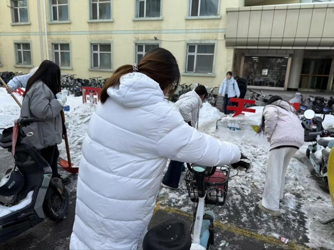 与此同时,第一组志愿者对杏5楼前的积雪和薄冰进行全面清扫。志愿者们挥舞铁锹,铲除路面冰雪,清理边角死角,经过共同努力,路面恢复干净整洁,有效消除了出行安全隐患。