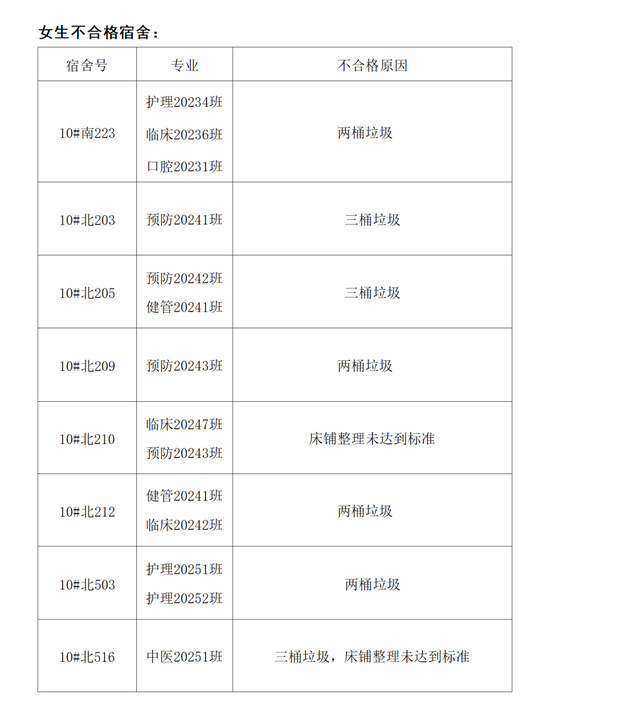 宿舍环境与同学们的生活质量、学习状态息息相关。在此,学院宿管会号召:希望优秀宿舍珍惜荣誉、持续精进,充分发挥榜样带头作用;需改进宿舍正视不足、限期整改,全面提升宿舍卫生与安全水平。同时,欢迎广大同学对宿舍管理工作建言献策,携手共建安全、整洁、温馨、和谐的宿舍家园。